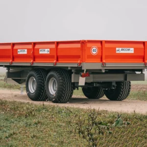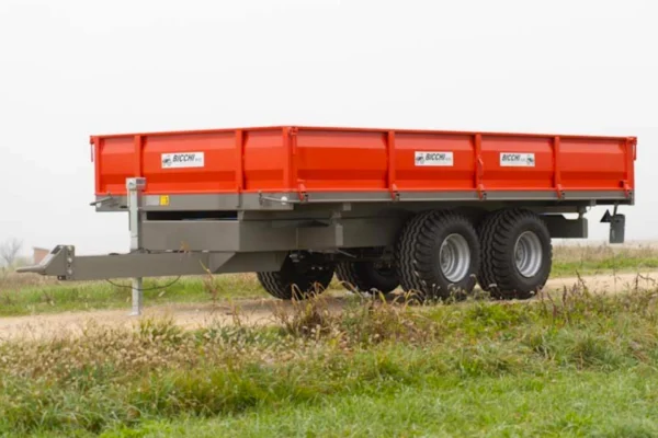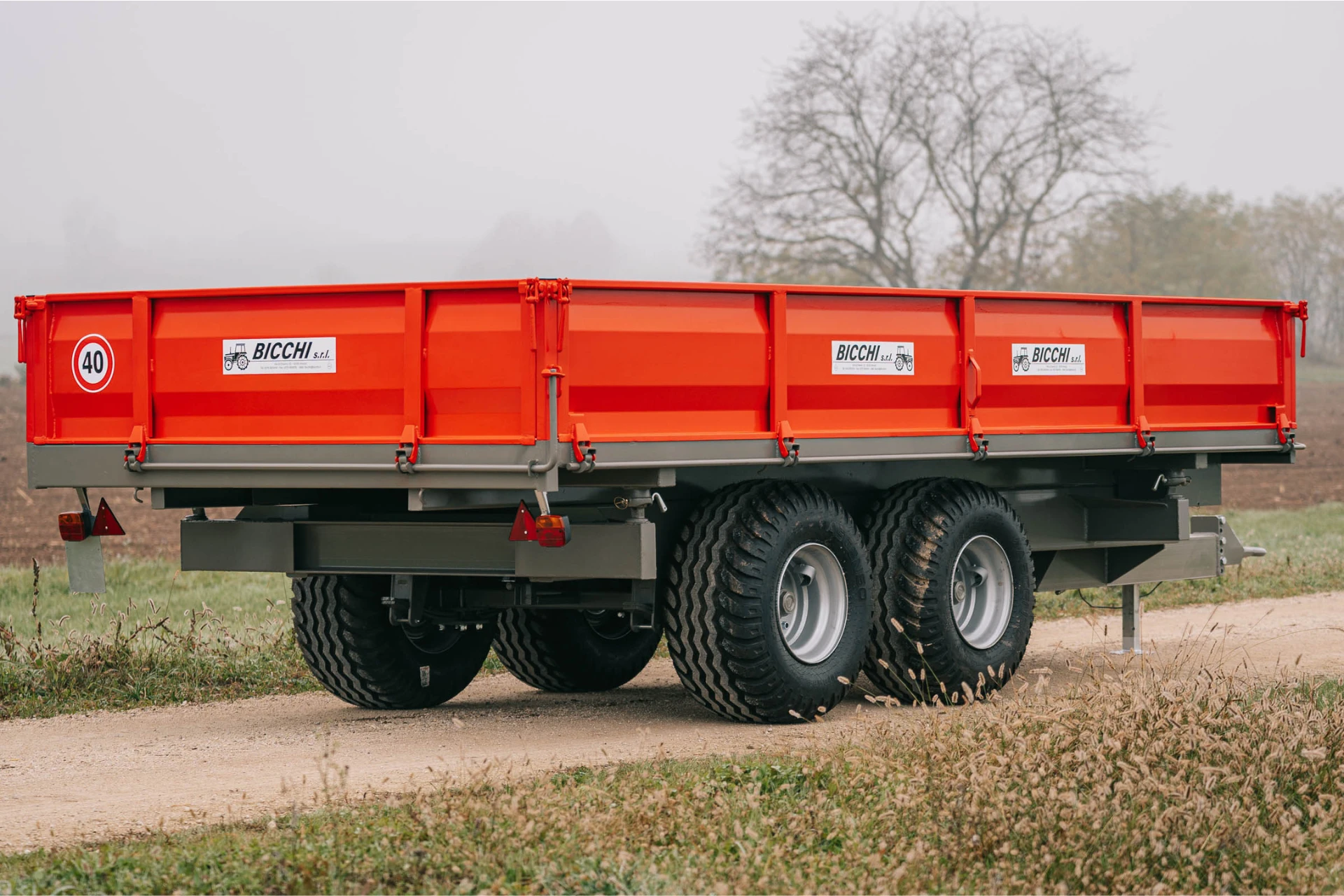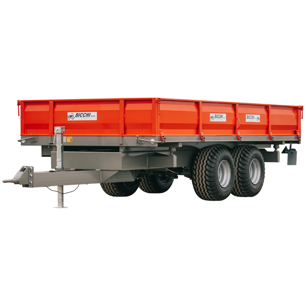 Gradbena prikolica Bicchi PGT 12 T je zmogljiva tandem izvedba italijanskega proizvajalca, zasnovana za intenziven transport materiala na gradbiščih in zahtevnih deloviščih. Konstrukcija je prilagojena stalni vožnji pri višjih traktorskih hitrostih, kjer tandem podvozje s paraboličnim vzmetenjem zagotavlja stabilnost, miren tek in enakomerno razporeditev obremenitev tako na cesti kot na terenu.