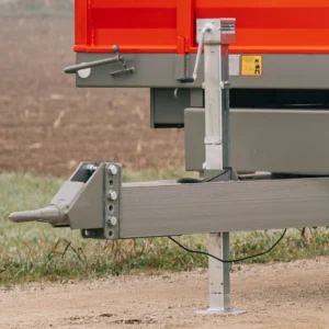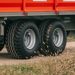 Podvozje je opremljeno s pnevmatikami dimenzije 400/60-15.5 v 16-plastni izvedbi, ki zagotavljajo visoko nosilnost, stabilnost in dober stik s podlago. Zaviralni sistem vključuje hidravlično in ročno zavoro, opcijsko je na voljo tudi zračna zavora za prilagoditev različnim traktorjem in zakonodajnim zahtevam. Priklop je nastavljiv po višini, kar omogoča pravilno vpetje in optimalen položaj prikolice med vožnjo.