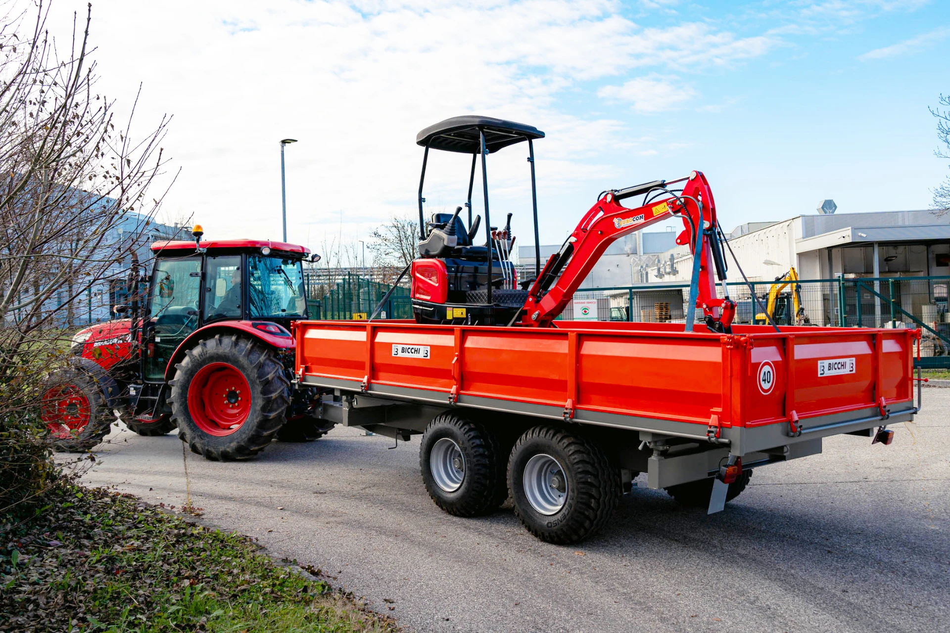 Bicchi PGT 12 T je homologirana za hitrost do 40 km/h in predstavlja robustno transportno rešitev za izvajalce, ki potrebujejo zanesljivo in volumensko učinkovito gradbeno prikolico za delo na gradbiščih in zahtevnih terenih.