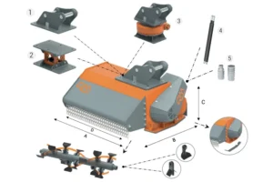 Konstrukcija vključuje robustno ohišje z dvojnim dnom, zadnji tlačni valj za stabilno vodenje po terenu ter ohišje zasnovano za mulčanje levo ali desno. Opremljen je s ploščo za vpetje, zaščito hidromotorja, zaščitno veriž­no zaveso in hidravličnim proti povratnim ventilom za zaščito sistema. Direktni prenos omogoča zanesljiv prenos moči, dvojni priklop hidravličnih cevi pa delovanje brez potrebe po drenažni cevi. Vse zaščitne naprave so izvedene v skladu s CE normativi.