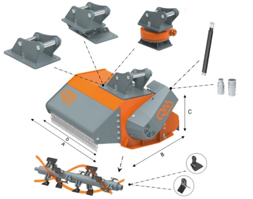 Mulčer deluje pri pretoku olja od 35 do 60 l na minuto in tlaku od 170 do 250 bar, skupna masa priključka znaša 215 kg. Na voljo so tudi dodatne opcije, kot so cevi za priklop, različna vpetja, rotator in plavajoči vmesnik, kar omogoča prilagoditev stroja specifičnim zahtevam na terenu.