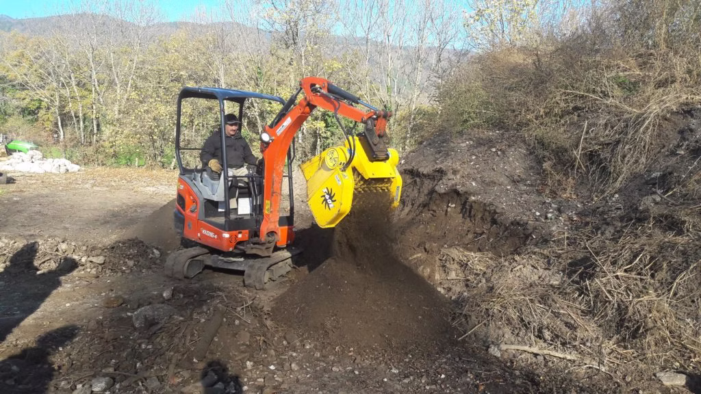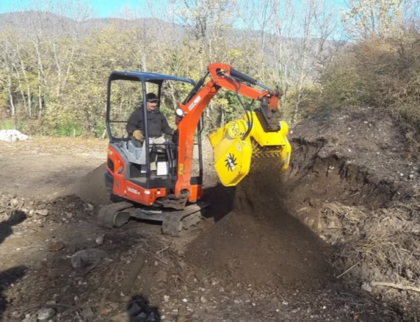 Opremljena je s tremi rotacijskimi valji, ki omogočajo enakomerno in neprekinjeno obdelavo materiala. Na voljo so različne kalibracije sejanja – 10, 15, 20 ali 40 mm – kar omogoča prilagoditev glede na vrsto materiala in zahteve projekta. Zajemalna odprtina 430 × 560 mm omogoča nemoten zajem, prostornina 0,13 m³ pa zadostuje za učinkovito delo brez pogostega ponavljanja ciklov. Teža 240 kg zagotavlja stabilno delovanje in primerno obremenitev stroja.