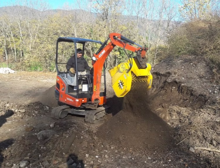 Delovanje poteka pri tlaku 200 bar in pretoku 55 l/min, kar omogoča mirno vrtenje valjev ter enakomerno ločevanje materiala. Žlica je primerna za sejanje zemlje, odstranjevanje kamenja, pripravo podlage, obdelavo komposta in drugih razsutih materialov.